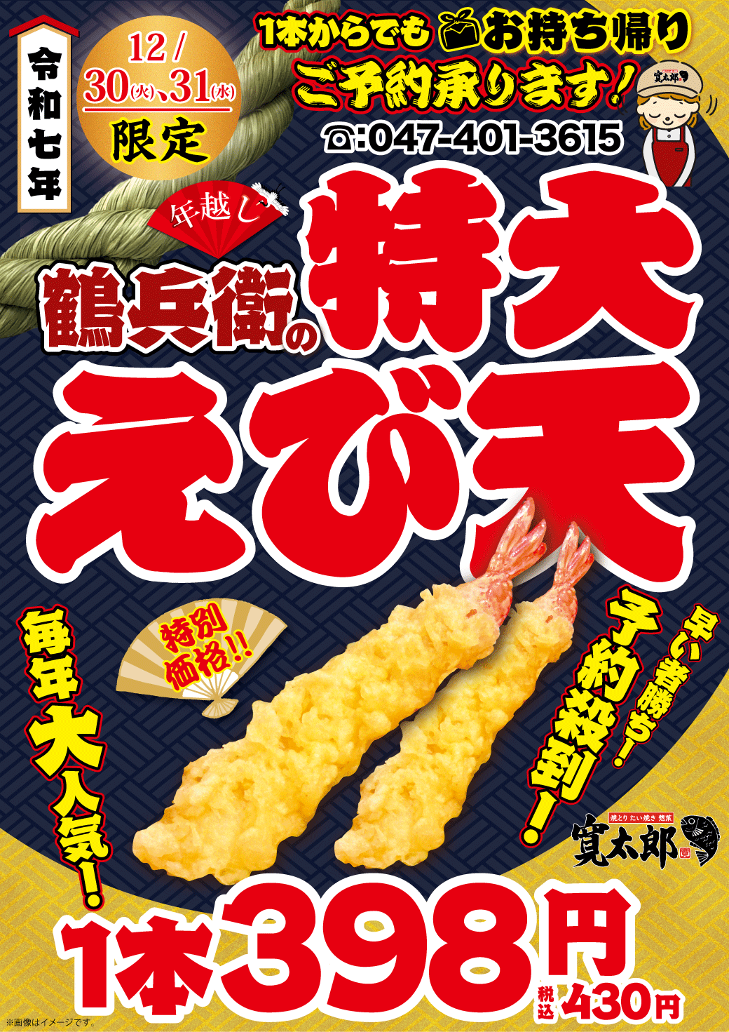 毎年大人気の、鶴兵衛の年越し『特大えび天』が寛太郎でもご購入いただけます!